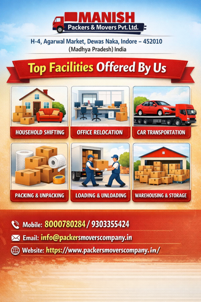 • Manish Packers and Movers in Indore provide comprehensive relocation services for both local and intercity moves.